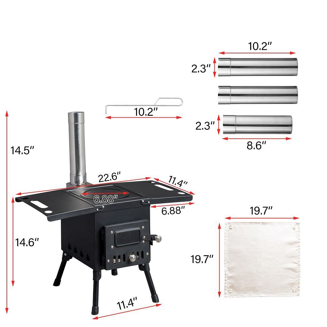 Portable Wood Stove.The folding racks on both sides increase the functionality of easy portability, 17.6lbs. The side frame can be used as a portable. The foldable legs can be folded flat under the stove. The chimney tube can be easily stored in the furnace for easy transportation and storage. The hook that comes with the wood stove makes it easy to clean the ashes at the bottom. Provide more convenience for your camping/hunting trip.